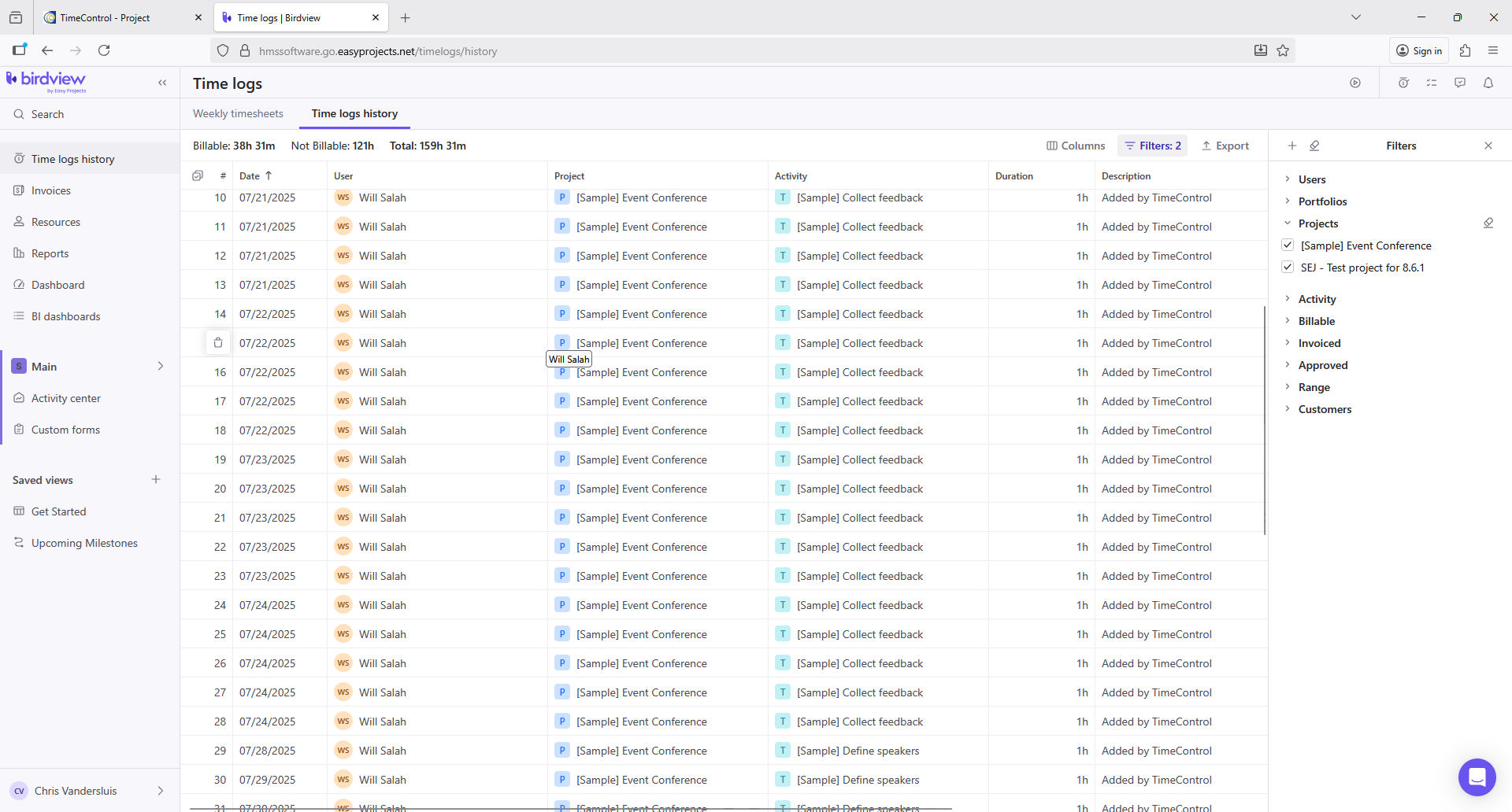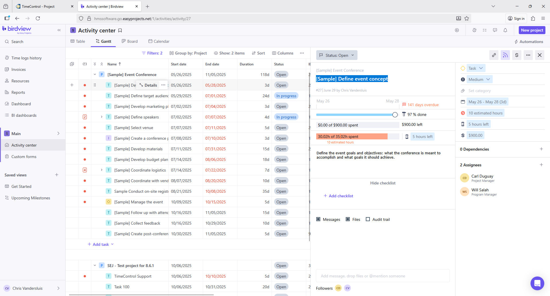 TimeControl fournit des données de feuilles de temps et de coûts vérifiables, utilisées à de nombreuses fins, notamment la paie, les RH, le calcul des coûts par projet, la conformité à la loi Sarbanes-Oxley, la conformité aux réglementations californiennes du travail et le suivi du crédit d'impôt pour la recherche et le développement. Birdview assure la planification et le suivi des projets, ainsi que la facturation.